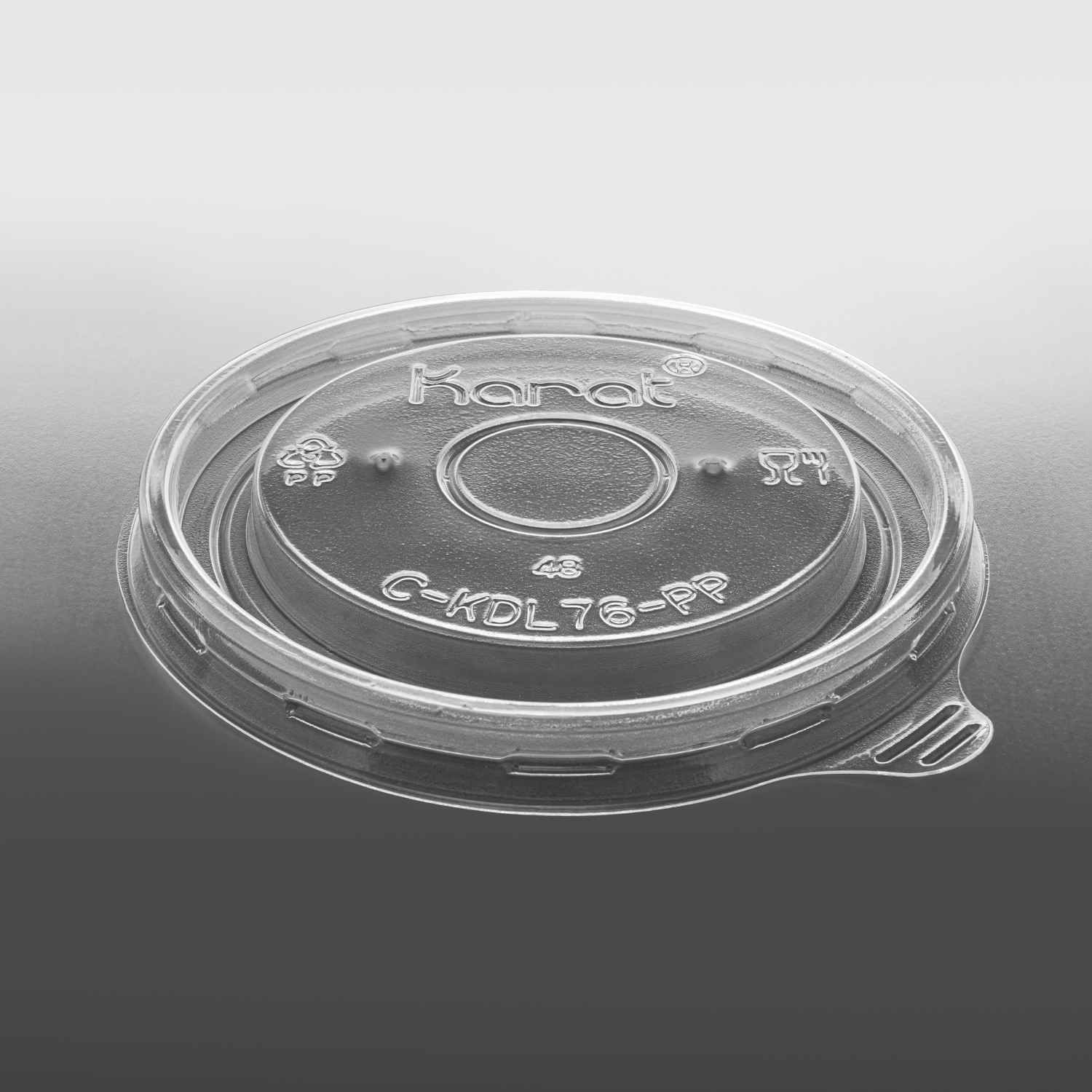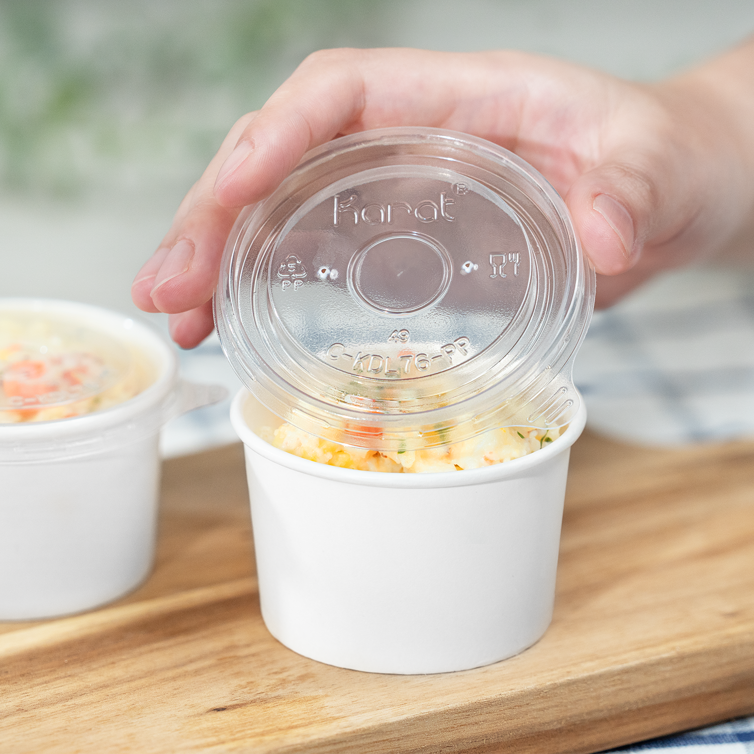 Karat high quality polypropylene (PP) flat lids are design to fit Karat double poly paper cold/hot food containers.