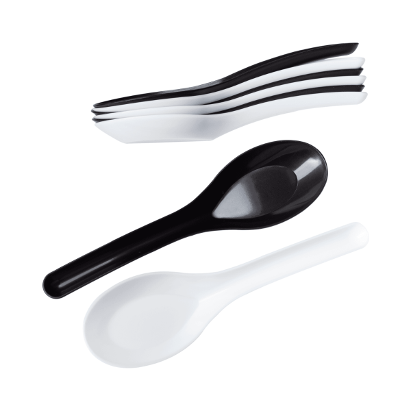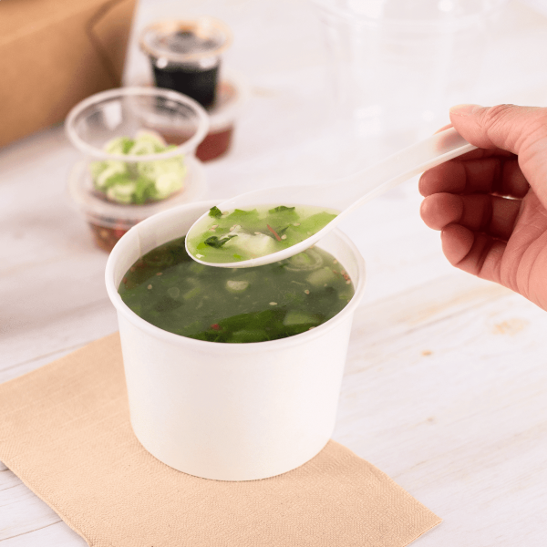 Use the Karat Asian Soup Spoon as an elegant disposable solution for soup take out. These plastic soup spoons have a flat wide base that can hold plenty of broth, noodles, or wontons. Food service operators offering ramen, pho, wonton soup or any other broth-based soup will want this spoon in their restaurant supply. The polypropylene material and wide handle make this a durable break-resistant spoon capable of holding heavier soups.