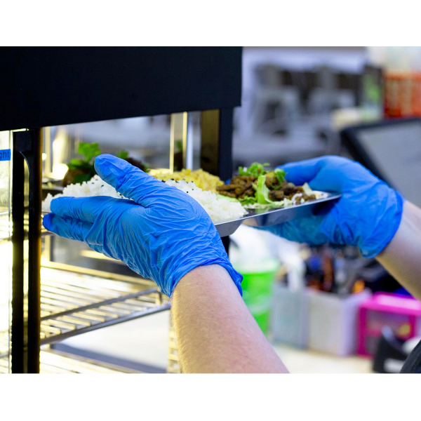 Karat Nitrile Gloves contain no latex and are powder-free. Having the highest level of touch sensitivity due to the glove’s ability to mold to your hand for a good fit, our nitrile gloves are good to wear for an extended amount of time. Of the four material types of gloves we offer, our nitrile gloves are the most puncture resistant and are colored blue to help identify if the glove has been punctured. These gloves are intended for food preparation purposes.