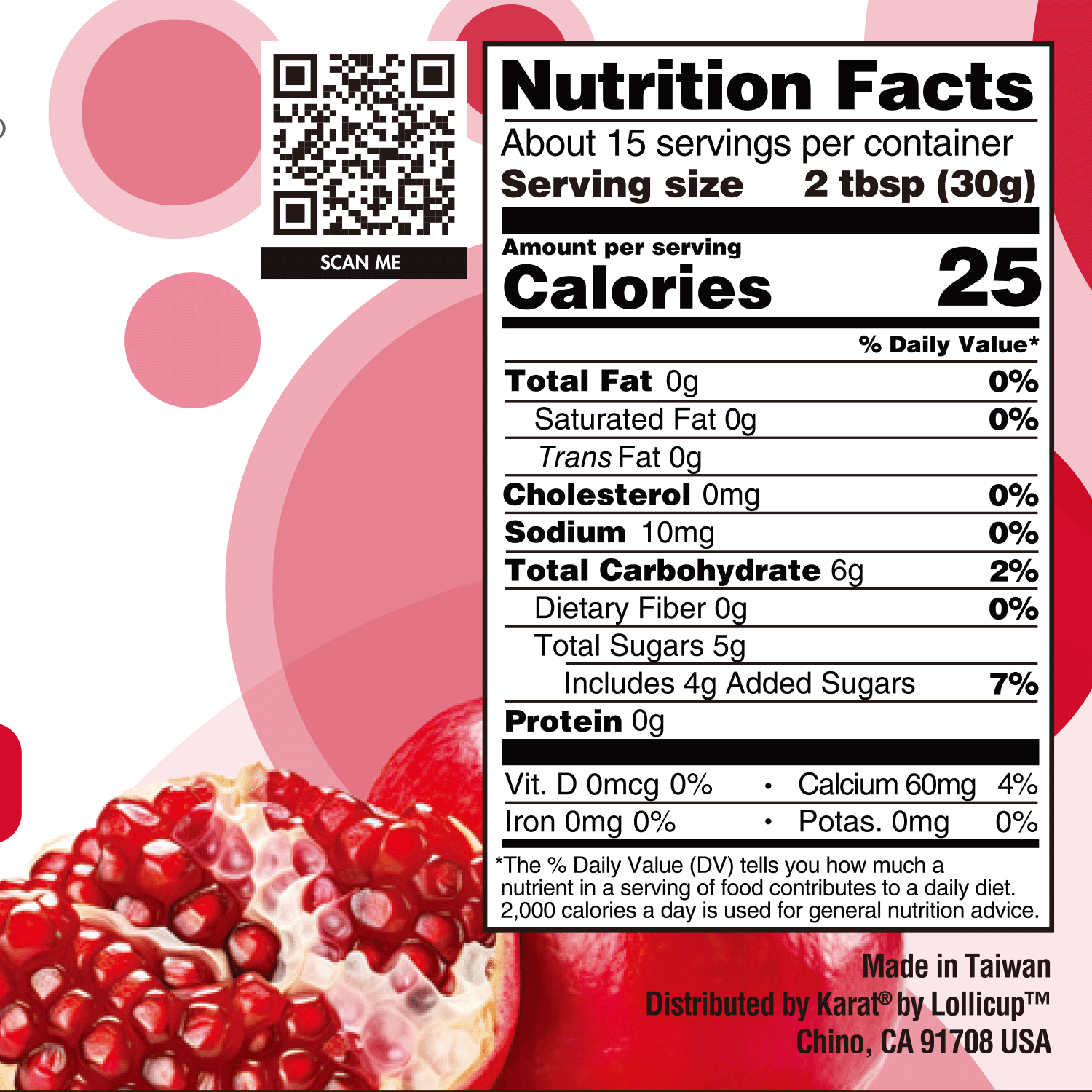 Ingredients: Water, Fructose, Pomegranate Flavored Syrup, Starch, Calcium Lactate, Seaweed Extract, Flavor, Malic Acid, Potassium Sorbate