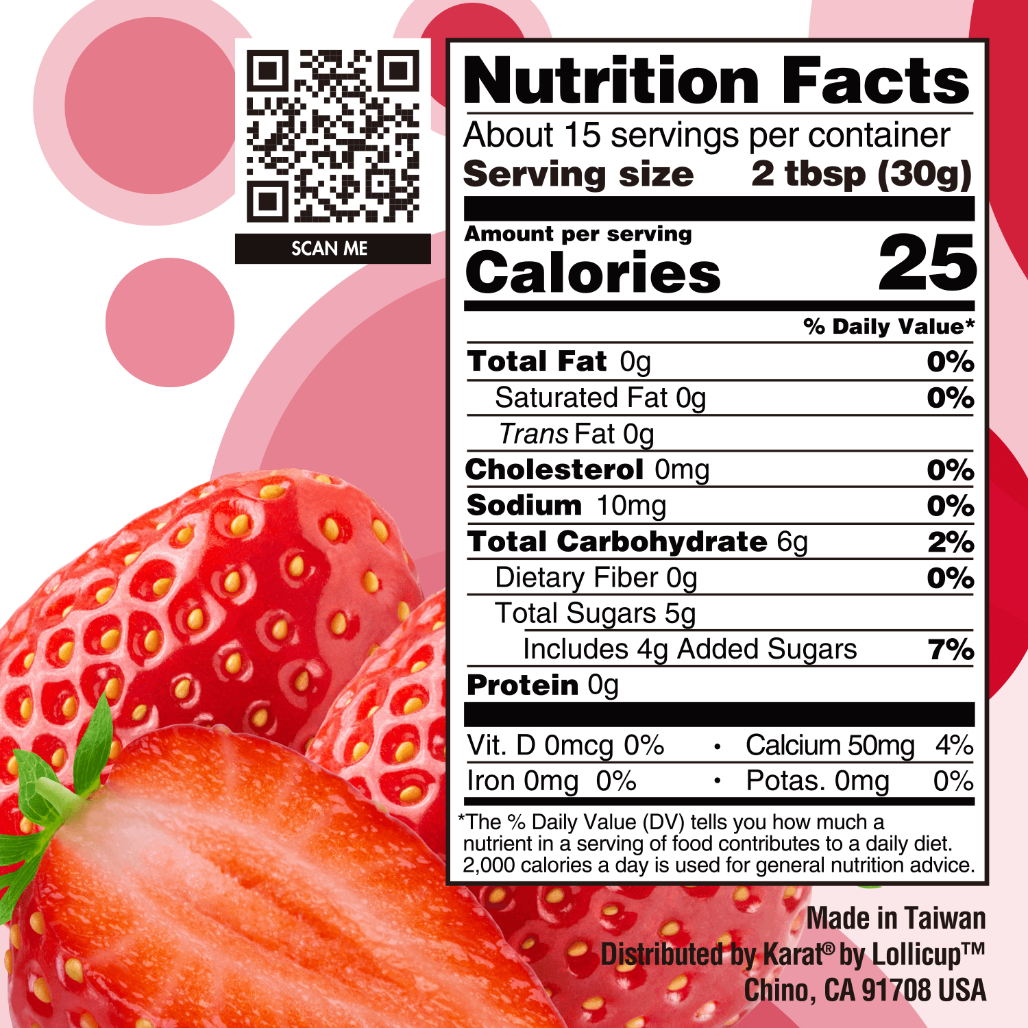 Ingredients: Water, Fructose, Starch Acetate, Calcium Lactate, Citric Acid, Sodium Alginate, Xanthan Gum, Strawberry Flavor, Calcium Chloride, Potassium Sorbate, Sodium Erythorbate, Sucralose, FD&C Red NO. 40, CMC