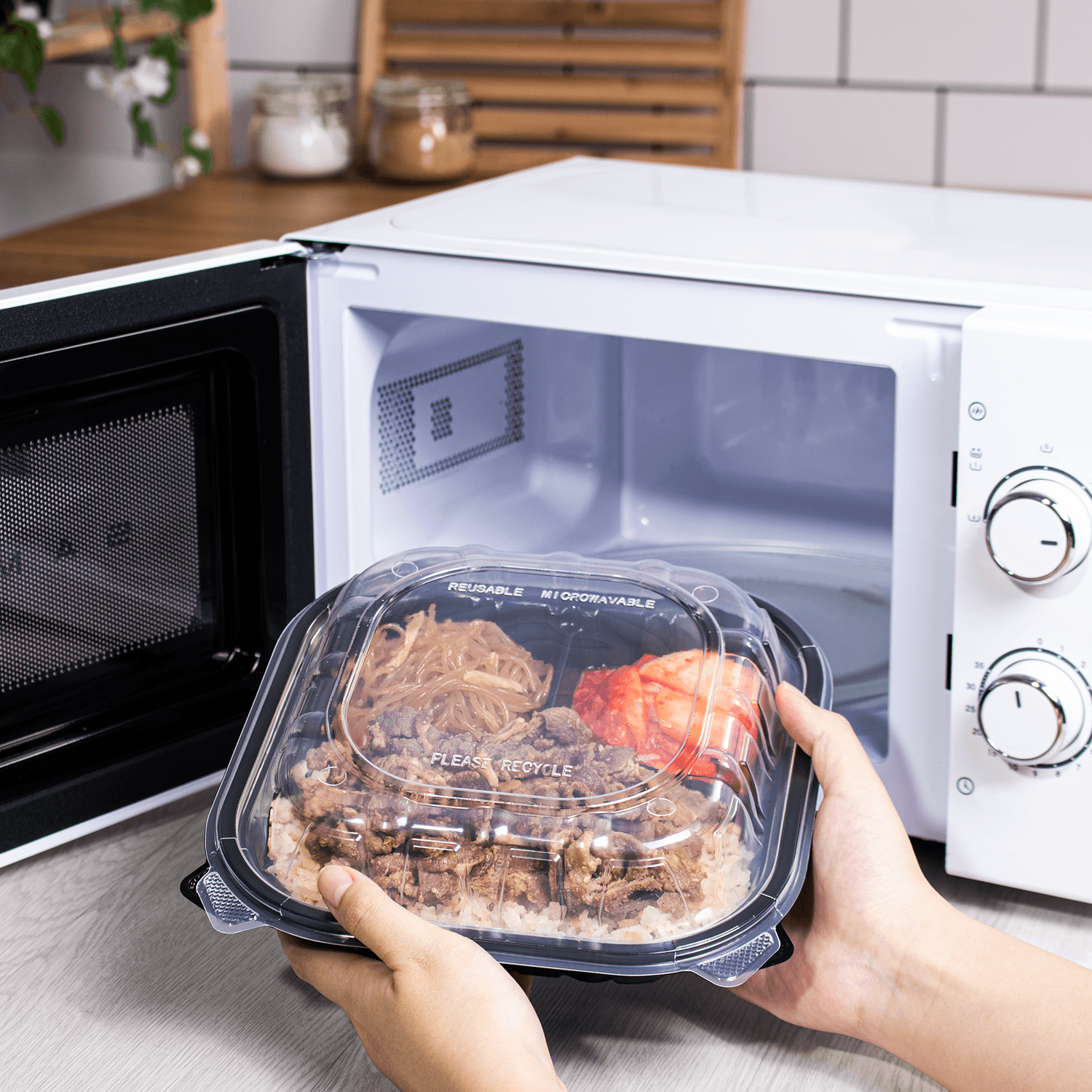 Karat® offers three types of hinged food containers, made of PET, PP, and Premium PP, designed for the safe and convenient transport of hot and cold foods. The Premium PP hinged containers are also ideal for hot, fresh food and microwaving, featuring four vents. These containers are sturdy and versatile, making them suitable for all types of food packaging.
