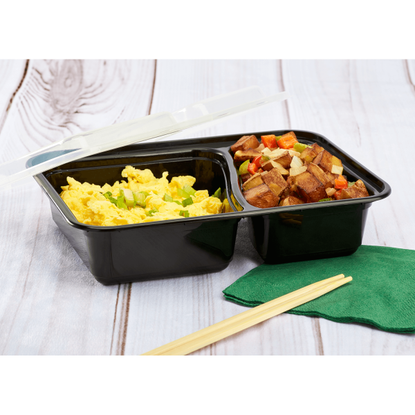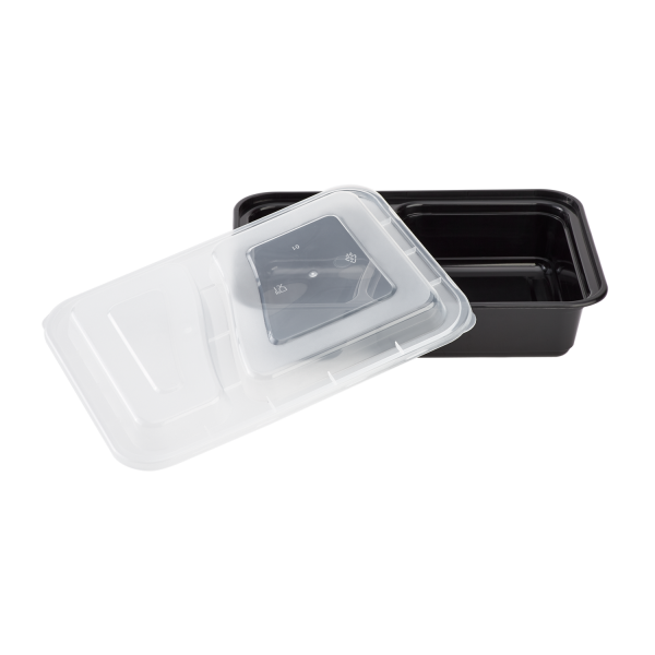 Karat round and rectangular black, PP injection molded containers and lids are great for takeout and leftovers. These containers are available in multiple sizes, and with multiple compartments. Containers are microwavable and dishwasher safe.