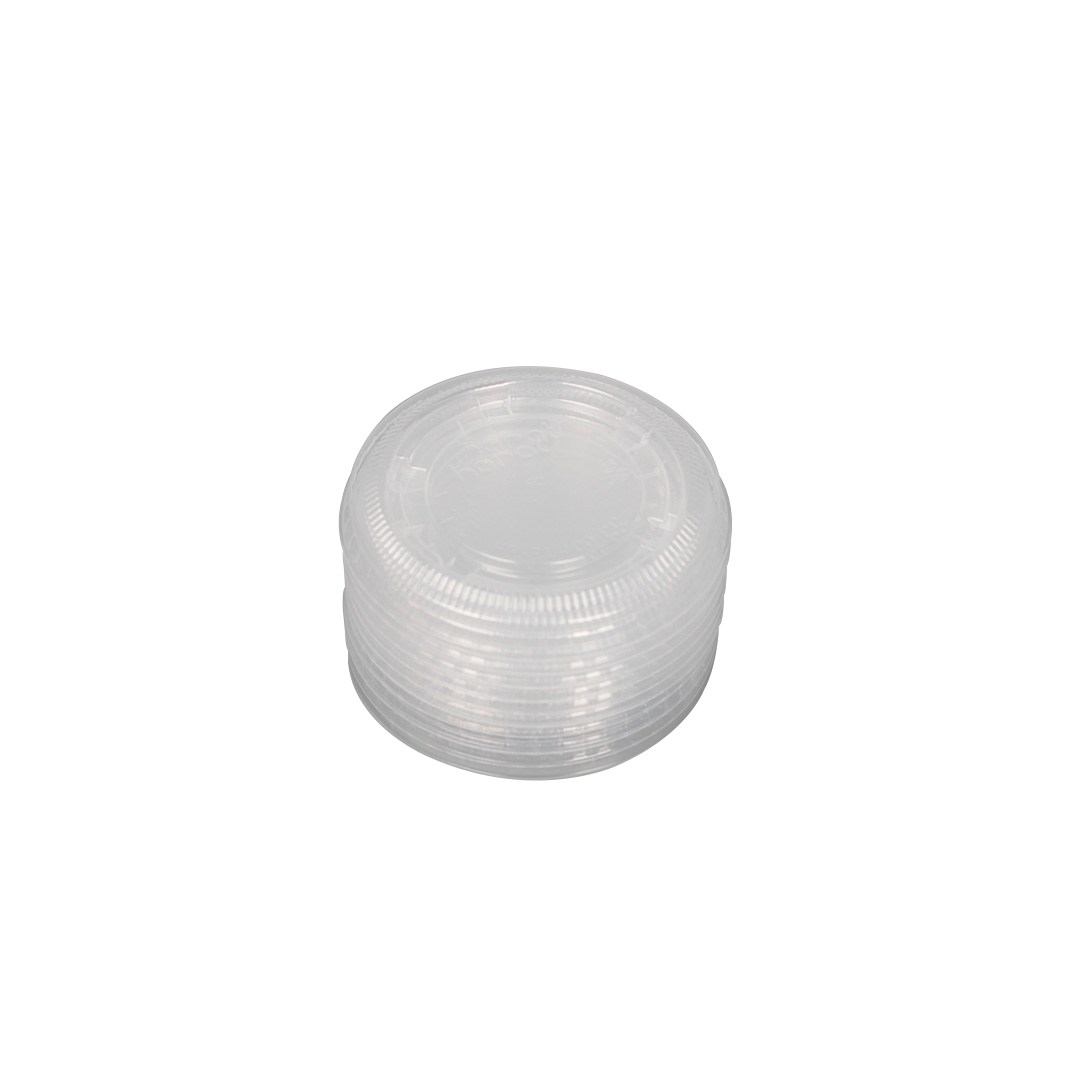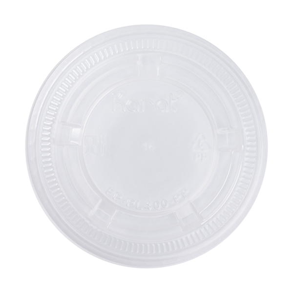 This Karat PP Plastic Portion Cup Lid fits portion cup sizes 3.25oz – 5.5oz. This lid will securely lock all contents inside allowing easy transportation for all condiments, dips and more! Easily portion our your sauces and dressing in Karat plastic souffle cups with lids.