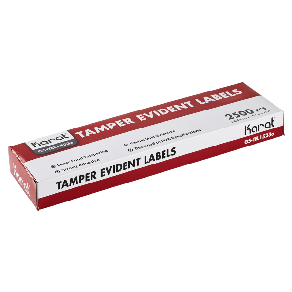 With takeout and food deliveries more prevalent, it is more important than ever to build trust for proper packaging. Give customers peace of mind by sealing food packaging with Karat Tamper Evident Labels. These labels will adhere securely and leave a void imprint upon removal to easily identify tampered packaging. The bold red tamper evident labels will deter food tampering so customers’ food will be delivered safely and securely.