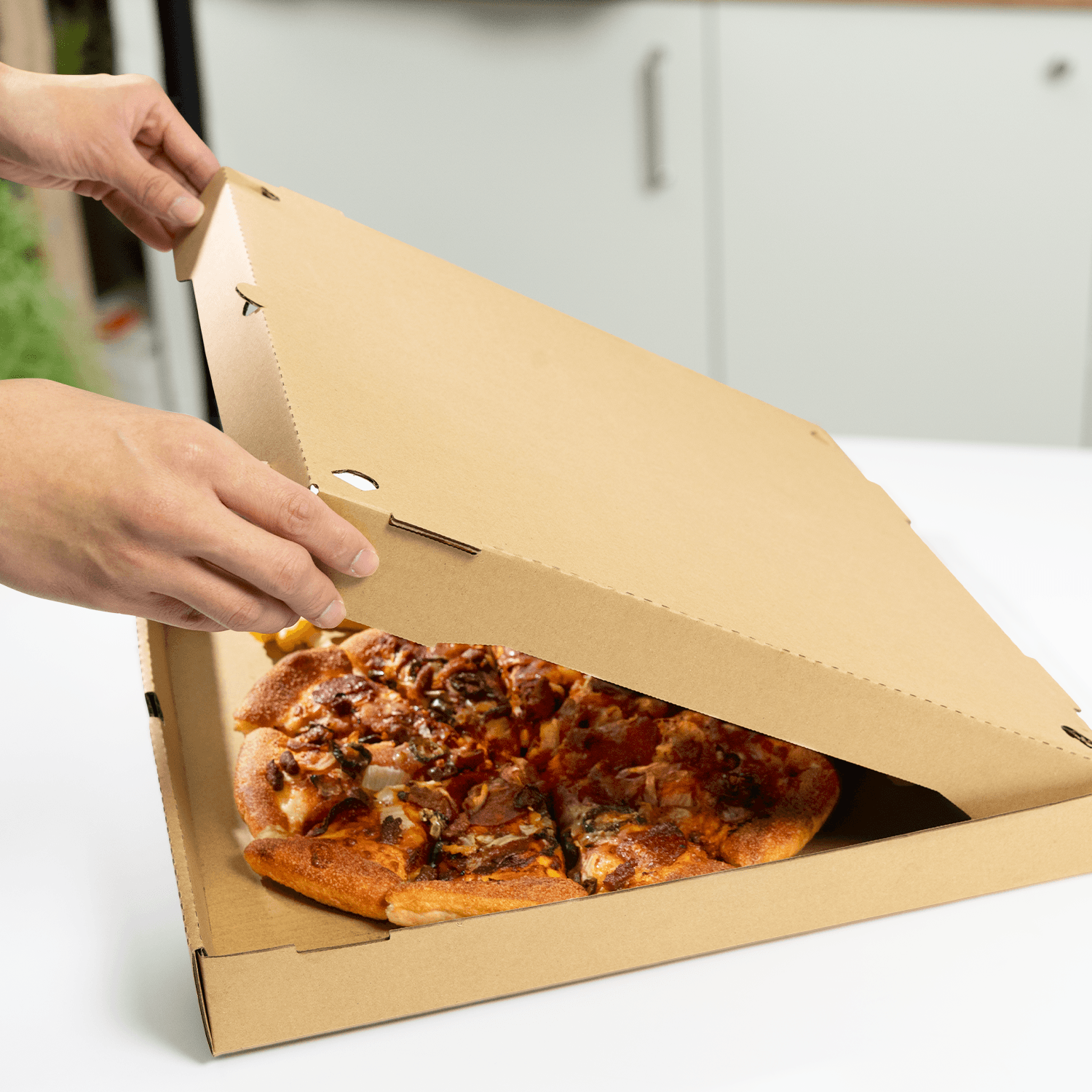 The thoughtful design features 4 vent holes on the top, ensuring your pizzas and pies remain fresh and delectable, reminiscent of just emerging from the oven. Enjoy a seamless dining experience by tearing the top off to transform the box into a generously-sized plate, eliminating the need for extra dishes.