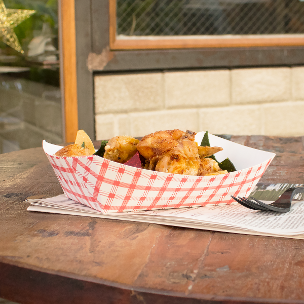 Bring nostalgic charm and practical convenience to your food service with these classic red and white checkered paper food trays. Made from lightweight yet durable paperboard, these trays are designed for single-use convenience and effortless cleanup, making them an ideal choice for high-traffic events, food trucks, casual dining, or self-serve stations.