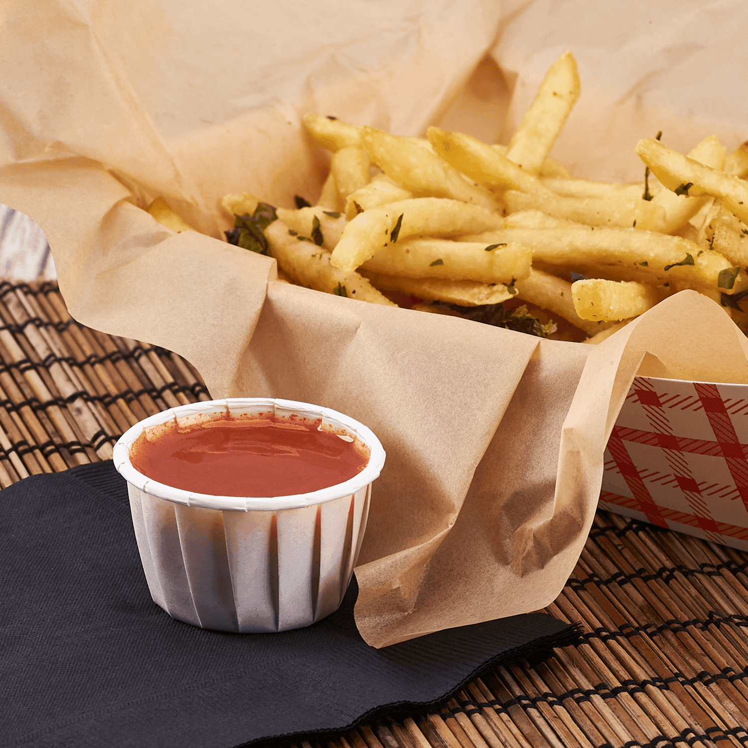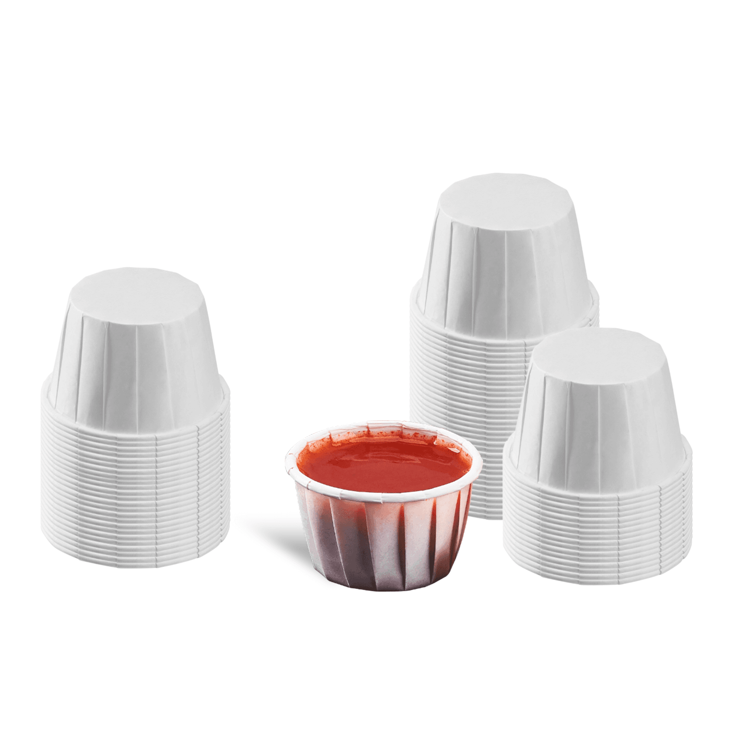 Karat 1.25 oz. paper portion cups are perfect for dispensing condiments, dressings, sauces or dips. The souffle portion cup has tightly rolled rims and box pleats making it sturdy and keeping it from tipping or spilling.