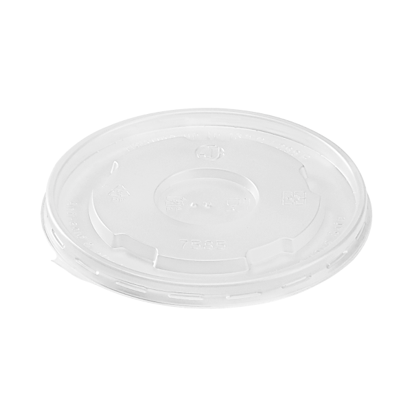 Karat high quality polypropylene (PP) flat lids are design to fit Karat double poly paper cold/hot food containers. Flat lids feature a venting hole for hot food items such as mashed potatoes and soups.