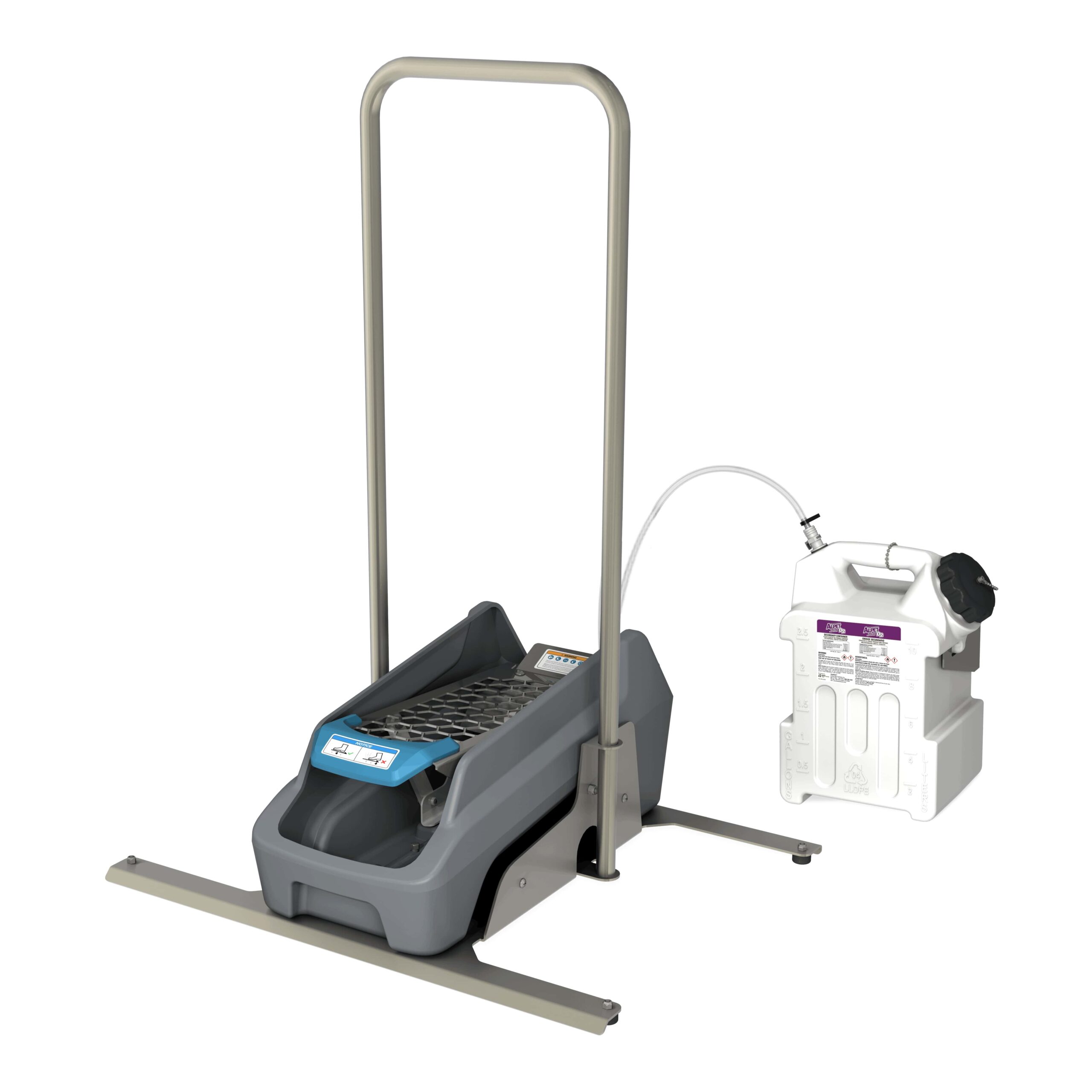 Footwear sanitation unit with a stainless-steel support handle and powered by the force of a human step. Includes a 2.5-gallon jug and draws from pre-mixed solution.