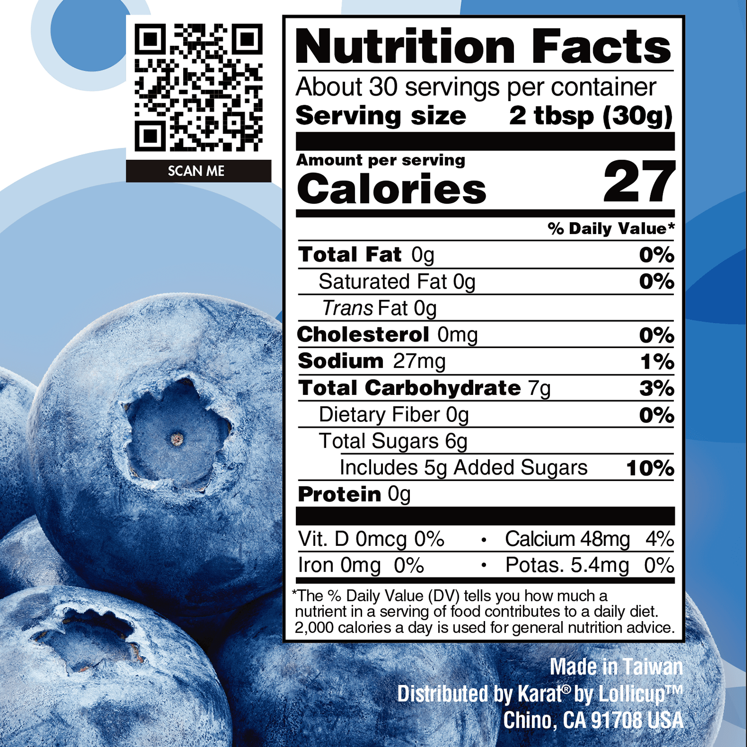 Ingredients: Fructose, Blueberry Syrup, Starch, Calcium Lactate, Citric Acid, Seaweed Extract, Blueberry Flavor, Potassium Sorbate, Xanthan Gum, FD&C Blue NO.2, FD&C Blue NO.1, Sucralose