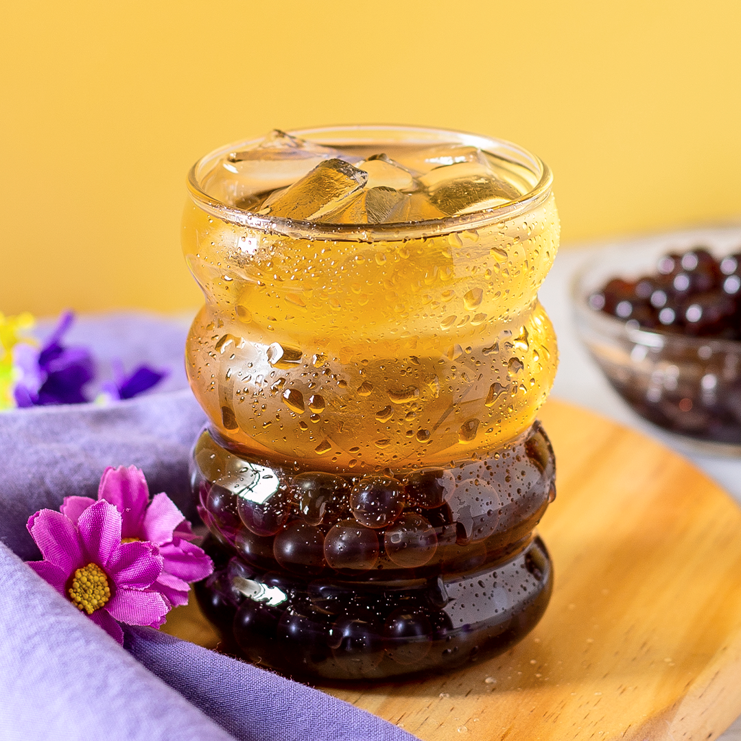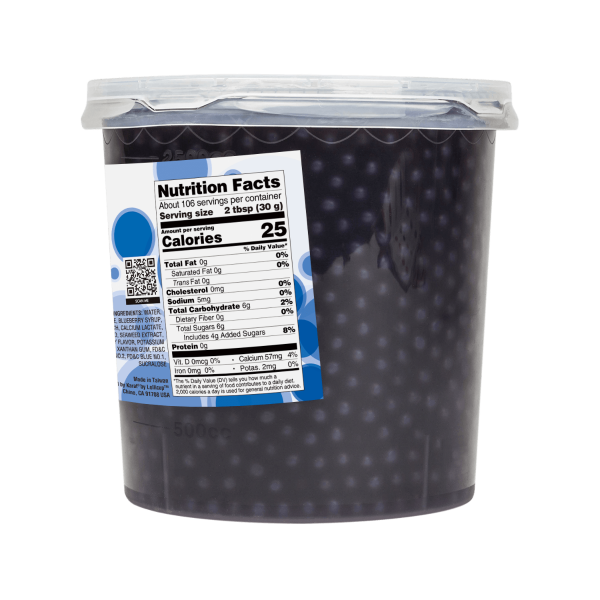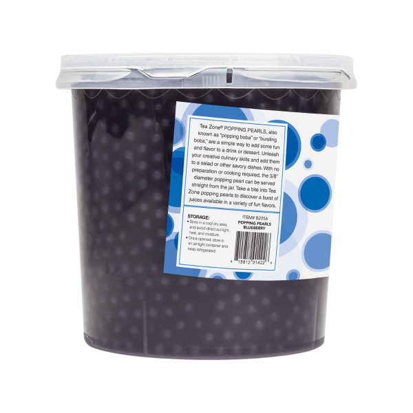 Popping pearls, aka. bursting boba, or popping boba, have fruit juice inside and it will burst when bitten into. Tea Zone Blueberry Popping Pearls are a fun add-on to your favorable drinks because of the vividly blue color and juicy inside. They are made of seaweed extract and filled with blueberry syrup.