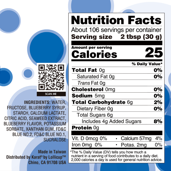 Fructose, Blueberry Syrup, Starch, Calcium Lactate, Citric Acid, Seaweed Extract, Blueberry Flavor, Potassium Sorbate, Xanthan Gum, FD&C Blue NO.2, FD&C Blue NO.1, Sucralose