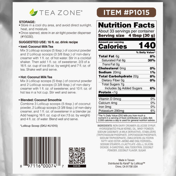 Get sent to a tropical paradise with Tea Zone Coconut Powder! It’s perfect for any beverage, hot or cold. Coconut Powder contains a creamy coconut-y flavor perfect in any smoothie, milk tea, and various blended drinks.