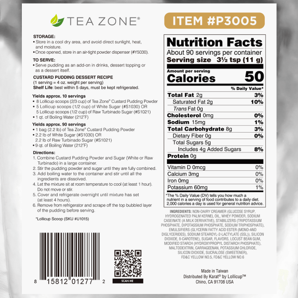 Tea Zone Custard Pudding Mix Powder is used to make flavored pudding. Create tantalizingly sweet treats that the whole family can enjoy! Whether you’re whipping up a batch of creamy custard or adding a fruity twist to a classic pudding, your taste buds won’t be disappointed!