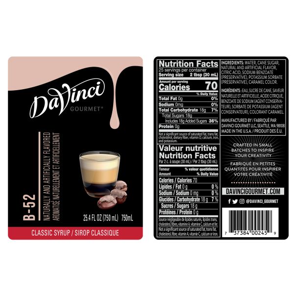 B-52 Flavored Syrup from DaVinci Gourmet is named for the famous bar drink made from Kahlua liqueur, Irish Cream, and Grand Marnier. This non-alcoholic syrup is a combination of coffee, Irish Cream, and a hint of orange flavor.