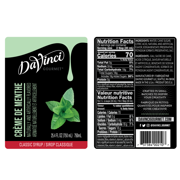 DaVinci Gourmet Crème De Menthe Syrup is crafted in small batches to inspire coffees, crafted beverages, cocktails, culinary creations and more. Made with pure cane sugar and delivers a sweet mint flavor without artificial color. It is formulated to mix easily in a wide range of beverage and culinary applications, including cocktails and mocktails. Can even put on ice cream. DaVinci Gourmet Crème De Menthe Syrup also resists curdling in dairy products, and perfectly holds its flavor in hot and cold beverages.