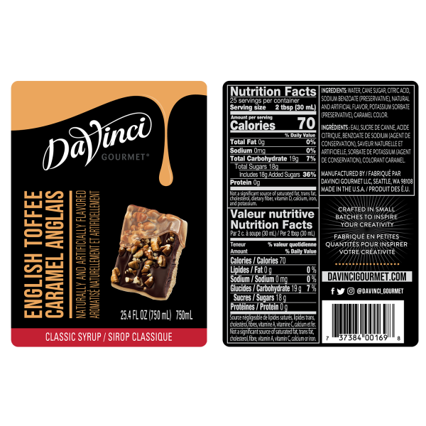 English Toffee Flavored Syrup from DaVinci Gourmet has a smooth, buttery flavor that is reminiscent of the classic candy. Made with pure cane sugar.
