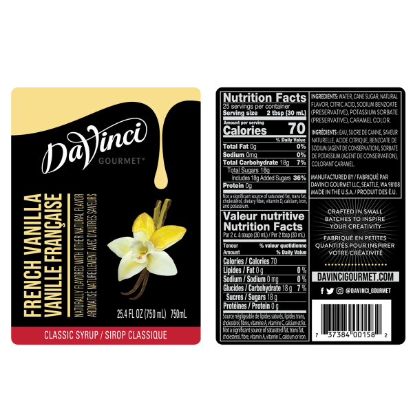French Vanilla Flavored Syrup from DaVinci Gourmet has a creamy, rich, custard-like essence of the ice cream and is perfect way to give your favorite drink that perfect, vanilla-y flavor. Made with pure cane sugar.