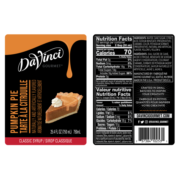 Pumpkin Pie Flavored Syrup from DaVinci Gourmet blends together pumpkin, cinnamon, nutmeg, allspice and ginger and is reminiscent of the popular holiday dessert. Made with pure cane sugar.