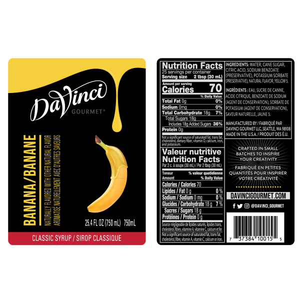 Banana Flavored Syrup from DaVinci Gourmet is a great way to add the delicious taste of freshly ripened bananas to your favorite beverage or culinary creation.