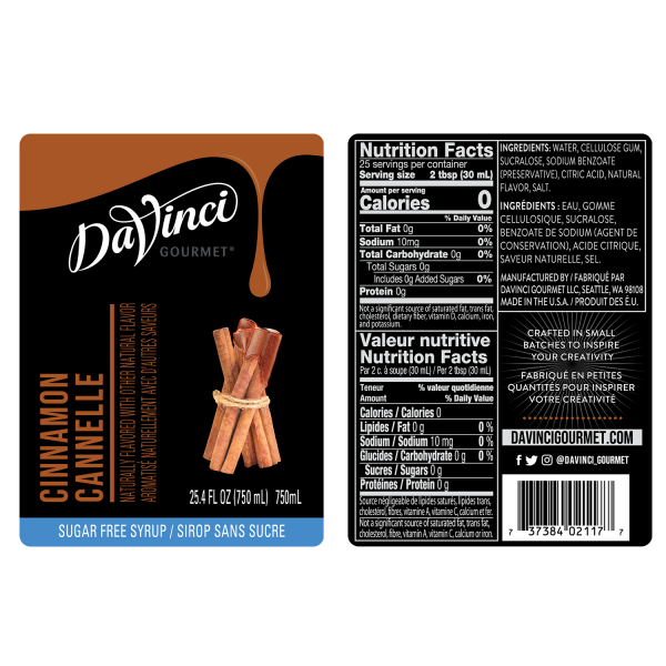 Sugar Free Cinnamon Syrup from DaVinci Gourmet is a perfect combination of sweet and spicy; add this delightfully warm flavor to your favorite beverage. Sweetened with SPLENDA® Brand Sweetener.
