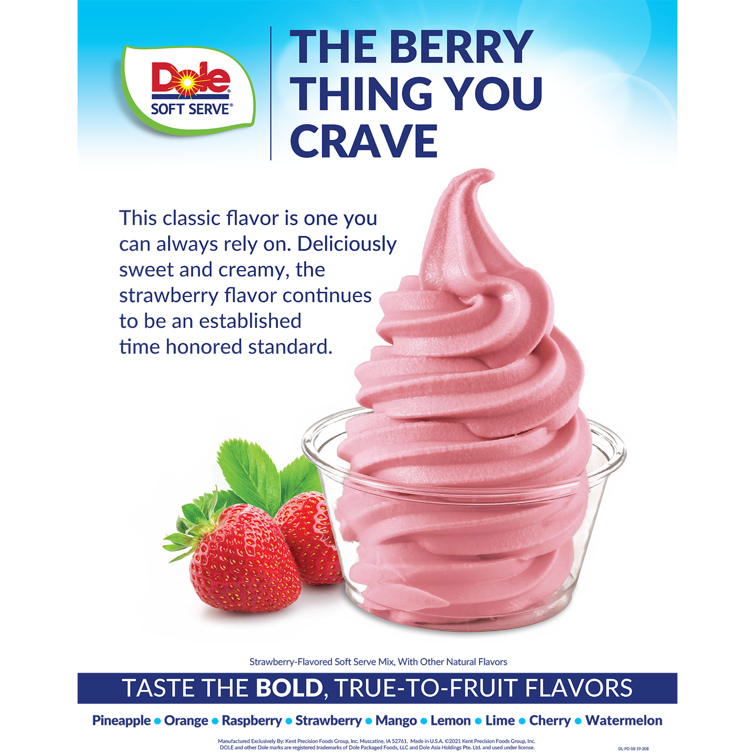 DOLE Strawberry Soft Serve Mix is a dry soft serve mix that makes it fast and easy for you to whip up healthy treats with real fruit flavor. Offer your patrons a lighter, better-for-you frozen treat that is fat-free, dairy-free, gluten-free, contains no cholesterol, and is suitable for a vegan diet. And because it’s bursting with the sweet fruit flavor and all natural coloring customers prefer, your sales will take a cool turn upward.