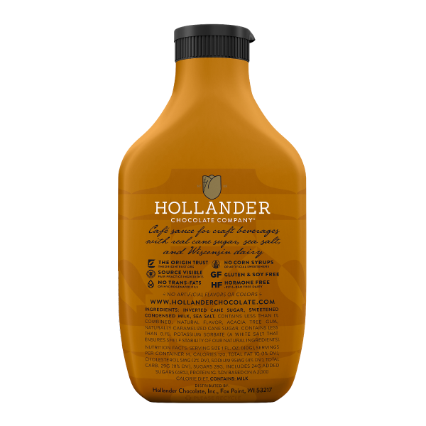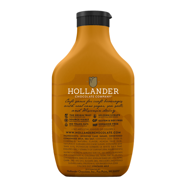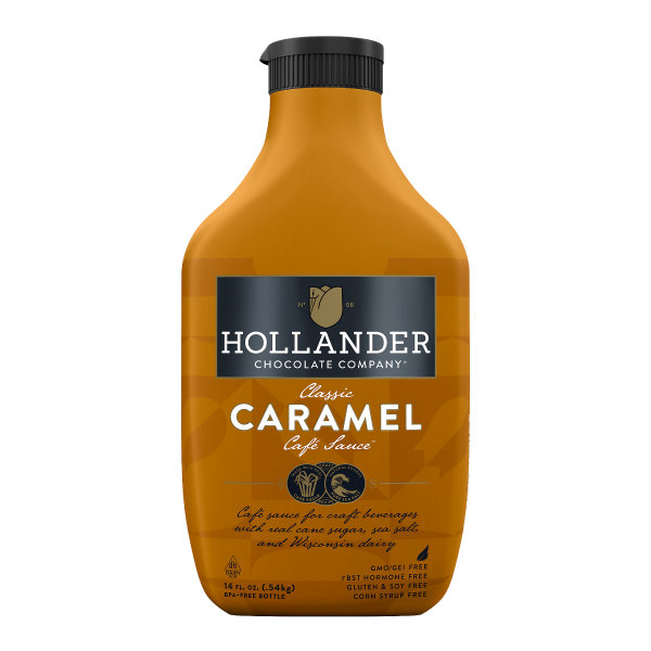 Hollander Classic Caramel Cafe Sauce is made with real cane sugar, sea salt, and natural vanilla. Enhance your coffeehouse beverages with this sweet, delicious sauce.