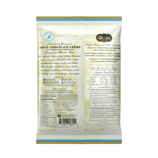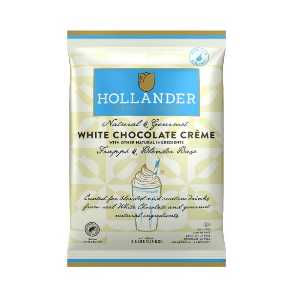 Hollander White Chocolate Crème Frappé & Blender Base contains cocoa butter and vanilla to create the sweet and nutty flavors of real white chocolate. Pair with coffee, desserts and more!