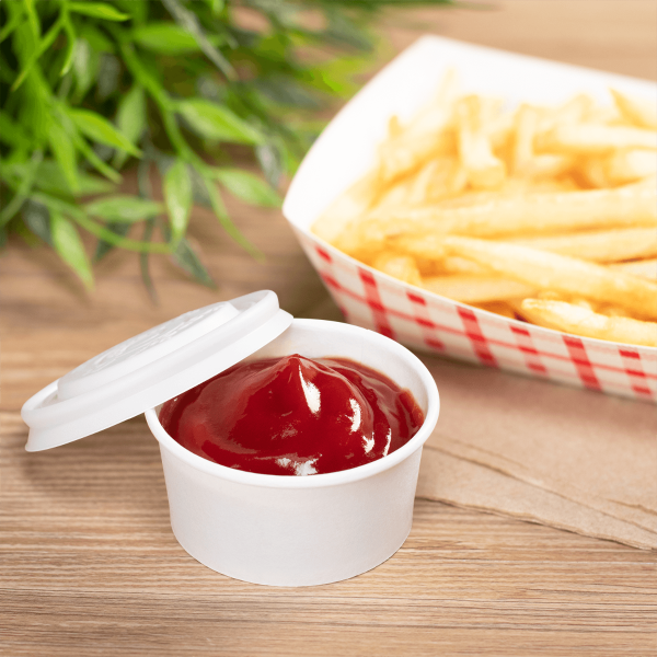 Karat Earth 2oz Eco-Friendly Paper Portion Cups make it easier to serve sides, salsas and sauces to go without plastic waste.