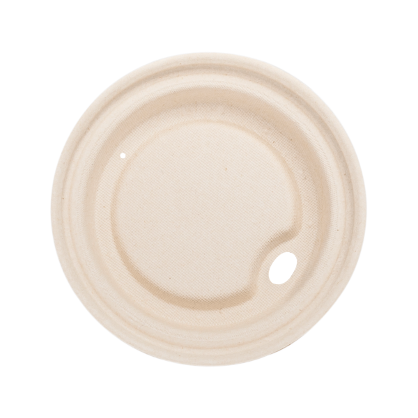 Karat Earth Eco-Friendly Bagasse Sipper Lids securely sit atop 10-24 oz paper hot cups to provide a plastic-free alternative and a steady flow when drinking.