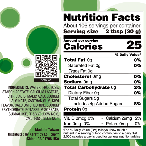 Water, Fructose, Starch Acetate, Calcium Lactate, Citric Acid, Malic Acid, Sodium Alginate, Xanthan Gum, Kiwi Flavor, Calcium Chloride, Sodium Erythorbate, Potassium Sorbate, Sucralose, FD&C Yellow No.6, CMC, FD&C Blue No. 1