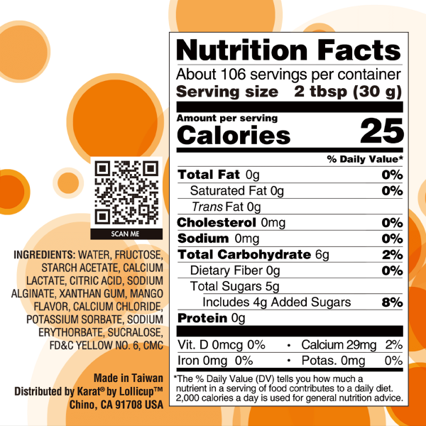 Ingredients: Water, Fructose, Starch Acetate, Calcium Lactate, Citric Acid, Sodium Alginate, Xanthan Gum, Mango Flavor, Calcium Chloride, Potassium Sorbate, Sodium Erythorbate, Sucralose, Fd&C Yellow No. 6, CMC