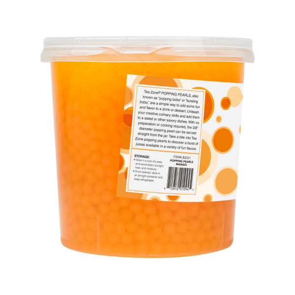 Tea Zone Mango Popping Pearls are juice pearls filled with a juicy Mango flavor. They are a great addition to iced teas, slushies, smoothies, and more!