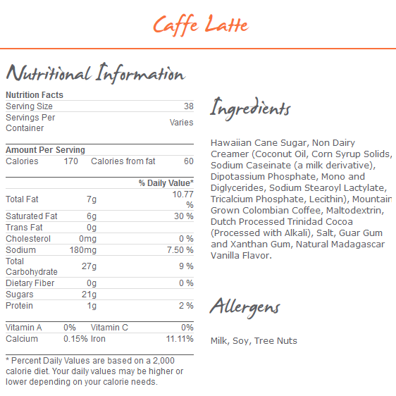 Ingredients: Sugar, Non Dairy Creamer (Coconut Oil, Corn Syrup Solids, Sodium Caseinate (a milk derivative), Dipotassium Phosphate, Mono and Diglycerides, Sodium Stearoyl Lactylate, Tricalcium Phosphate, Lecithin), Coffee, Maltodextrin, Cocoa (Processed with Alkali), Salt, Guar Gum and Xanthan Gum, Natural Flavor.