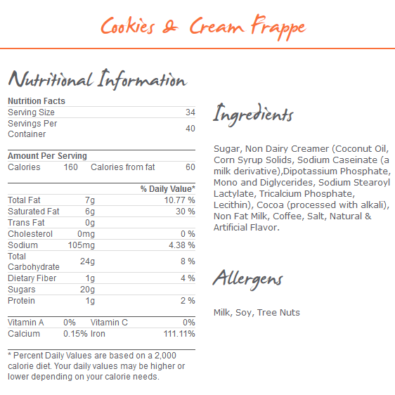 MoCafe’s Cookies & Cream Frappe consists of chocolate sandwich cookies blended with mildly roasted Colombian coffee. MoCafe gourmet frappe mixes use select exotic ingredients for maximum flavor and yield, such as Trinidad nib roasted cocoas, Tahitian vanillas, African Forestero cocoas, and Colombian coffees to create the best tasting frappe.