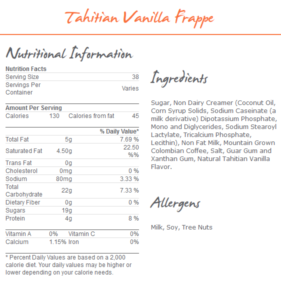 Ingredients: Sugar, Non Dairy Creamer (Coconut Oil, Corn Syrup Solids, Sodium Caseinate (a milk derivative) Dipotassium Phosphate, Mono and Diglycerides, Sodium Stearoyl Lactylate, Tricalcium Phosphate, Lecithin), Non Fat Milk, Mountain Grown Colombian Coffee, Salt, Guar Gum and Xanthan Gum, Natural Tahitian Vanilla Flavor.