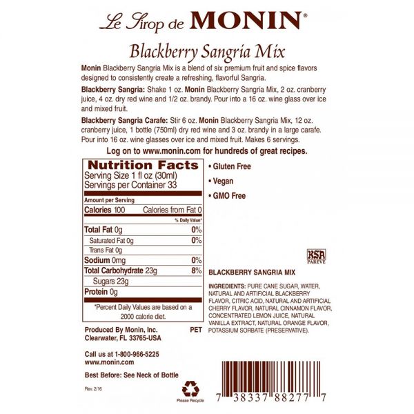 The traditional blend of fruits, spices, wine and brandy just got a whole new twist. The Monin Blackberry Sangria Mix brings berry flavor and effortless execution to this delicious favorite, so you can just add wine and skip the tedious preparation.