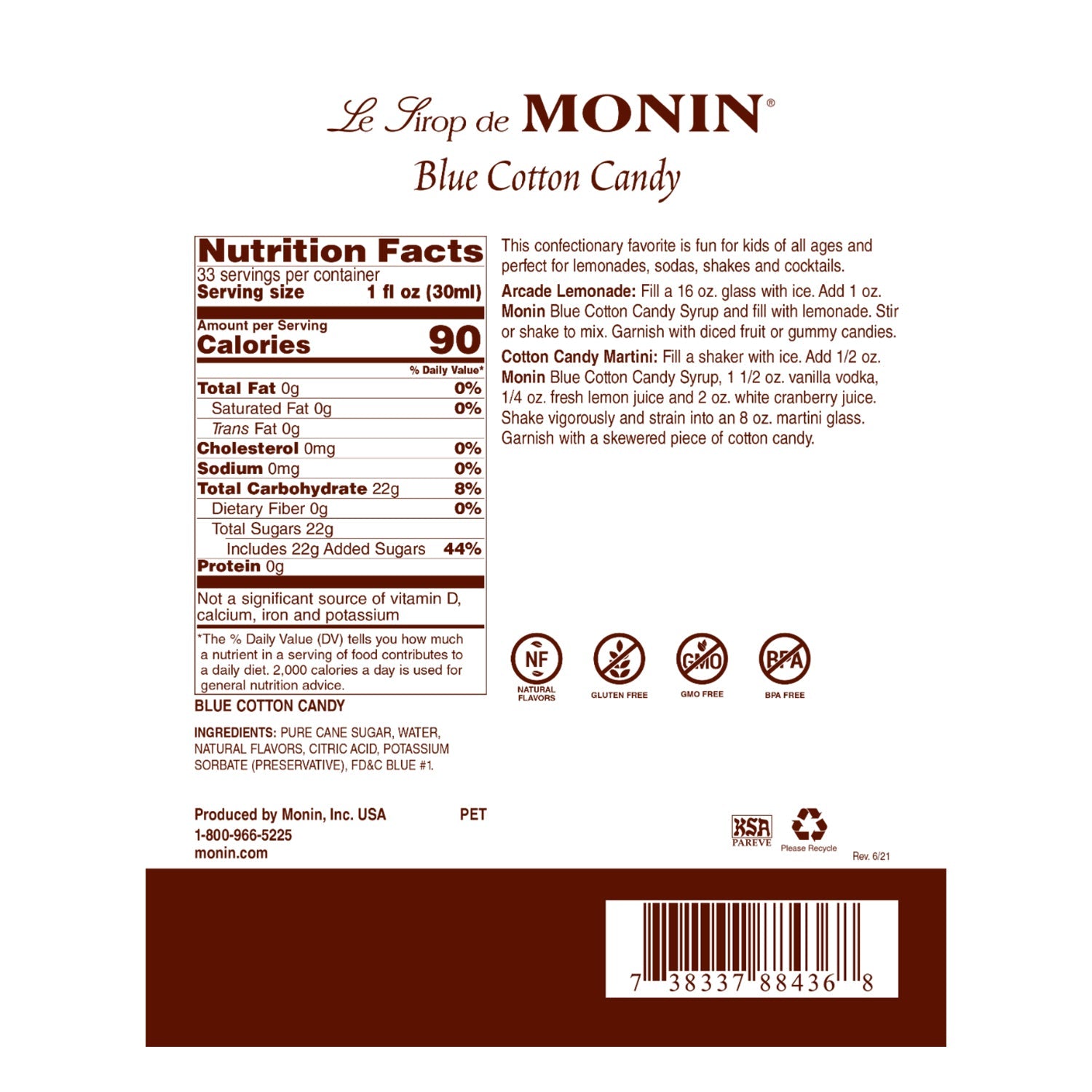 Cotton candy’s airy, fluffy texture and melt-in-your-mouth sensation are major factors in its flavor and popularity for kids of all ages. Monin Blue Cotton Candy Syrup bottles the taste and aroma of freshly spun cotton candy. Made with select ingredients and pure cane sugar, Monin Blue Cotton Candy Flavored Syrup is a highly concentrated, authentic flavoring offering exceptional versatility for creating specialty beverages.