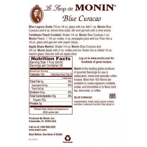 Featuring a mild orange peel flavor and a beautiful blue color, this Monin Syrup contains no alcohol which offers great versatility in alcoholic beverages and non-alcoholic beverages. Use Monin Blue Curacao syrup to flavor and color tropical drinks such as the Blue Hawaiian and L.A. Water.