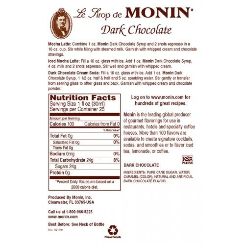 In the nineteenth century, the first chocolate bar was born. Nowadays, the rich, sweet flavor of chocolate is greatly popular around the world. Made with select ingredients and pure cane sugar, Monin Dark Chocolate Syrup is a highly concentrated, authentic flavoring offering exceptional versatility for creating specialty beverages.