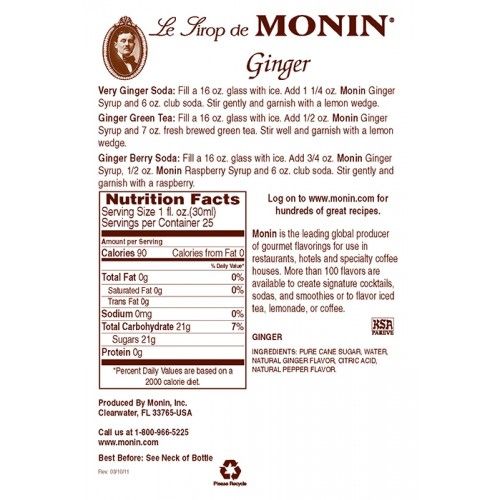 Ginger is a warming, peppery spice which is currently experiencing a comeback along with other classic spices. Aromatic Monin Ginger Syrup is ideal to add a distinctive, enticing flavor to any of your on-trend beverages; it may combine with a wide variety of ingredients and flavors from sweet to tart to savory. Made with select ingredients and pure cane sugar, Monin Ginger Syrup is a highly concentrated, authentic flavoring offering exceptional versatility for creating specialty beverages.