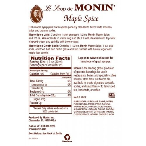 Deriving from the maple sap, maple syrup is traditionally used in culinary applications, especially over pancakes and waffles. Made with select ingredients and pure cane sugar, Monin Spicy Maple Spice Syrup is a highly concentrated, authentic flavoring offering exceptional versatility for creating specialty beverages.