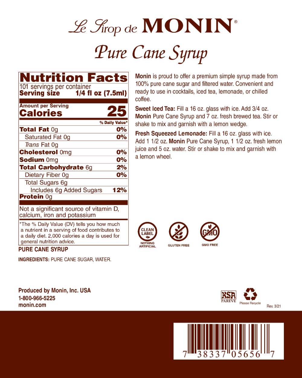 Monin is proud to offer Pure Cane Syrup; a premium simple syrup made with 100% American pure cane sugar and filtered water. Made with premium ingredients, Pure Cane Syrup is specially formulated to dissolve instantly in any hot or cold beverage, for fast convenient use with great taste.