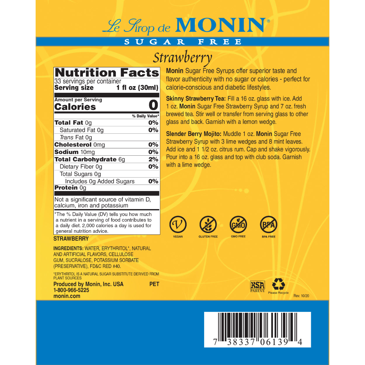 Monin Sugar Free Strawberry Syrup brings a touch of guilt-free sweetness and bold flavor to smoothies, handcrafted sodas, skinny cocktails, mocktails and more. Our Sugar Free Strawberry Syrup bottles their celebrated sweetness for your favorite cocktails, mocktails, sodas and teas without added sugar or calories.