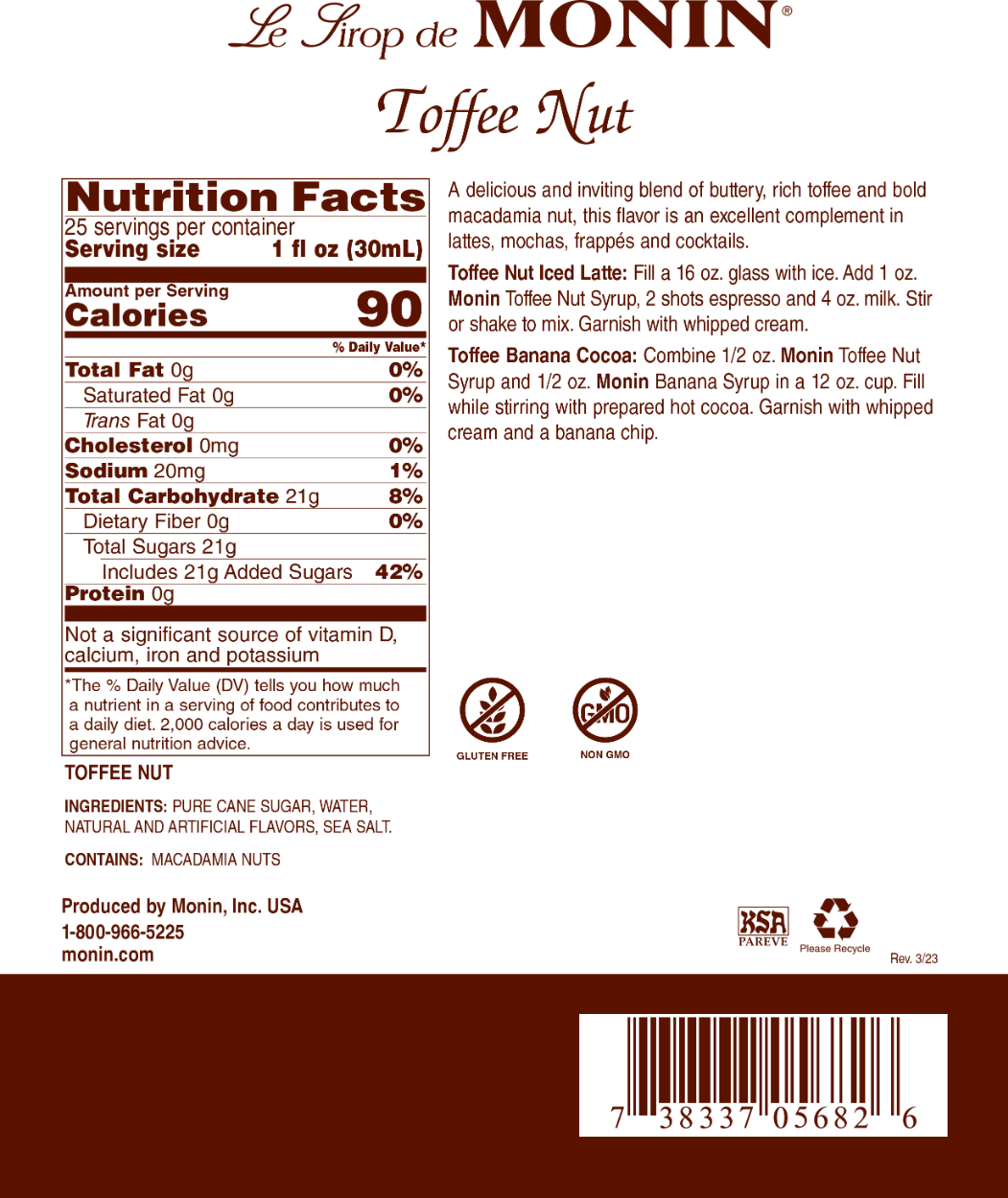 Monin Toffee Nut Syrup includes both the sweetness of toffee and the indulgence of macadamia nut. Made with select ingredients and pure cane sugar, Monin Toffee Nut Syrup is a highly concentrated, authentic flavoring offering exceptional versatility for creating specialty beverages.