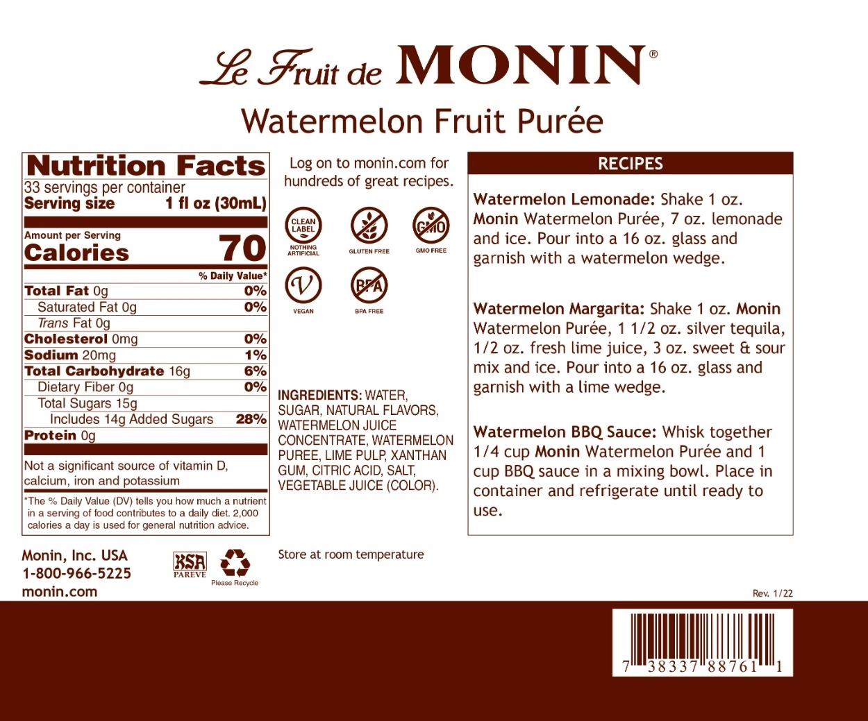 Capture the essence of summer all year round with Monin Watermelon Purée. The first slice of juicy, sweet watermelon is a quintessential summer experience, but now you can savor that moment with every sip. Our purée is made with real, ripe watermelon, delivering a true-to-nature taste and texture that will transport you to a warm summer day. Perfect for enhancing teas, lemonades, cocktails, and more, Monin Watermelon Purée adds a mouthwatering, juicy sweet melon flavor to any beverage. Order now and enjoy the refreshing taste of summer in every sip.