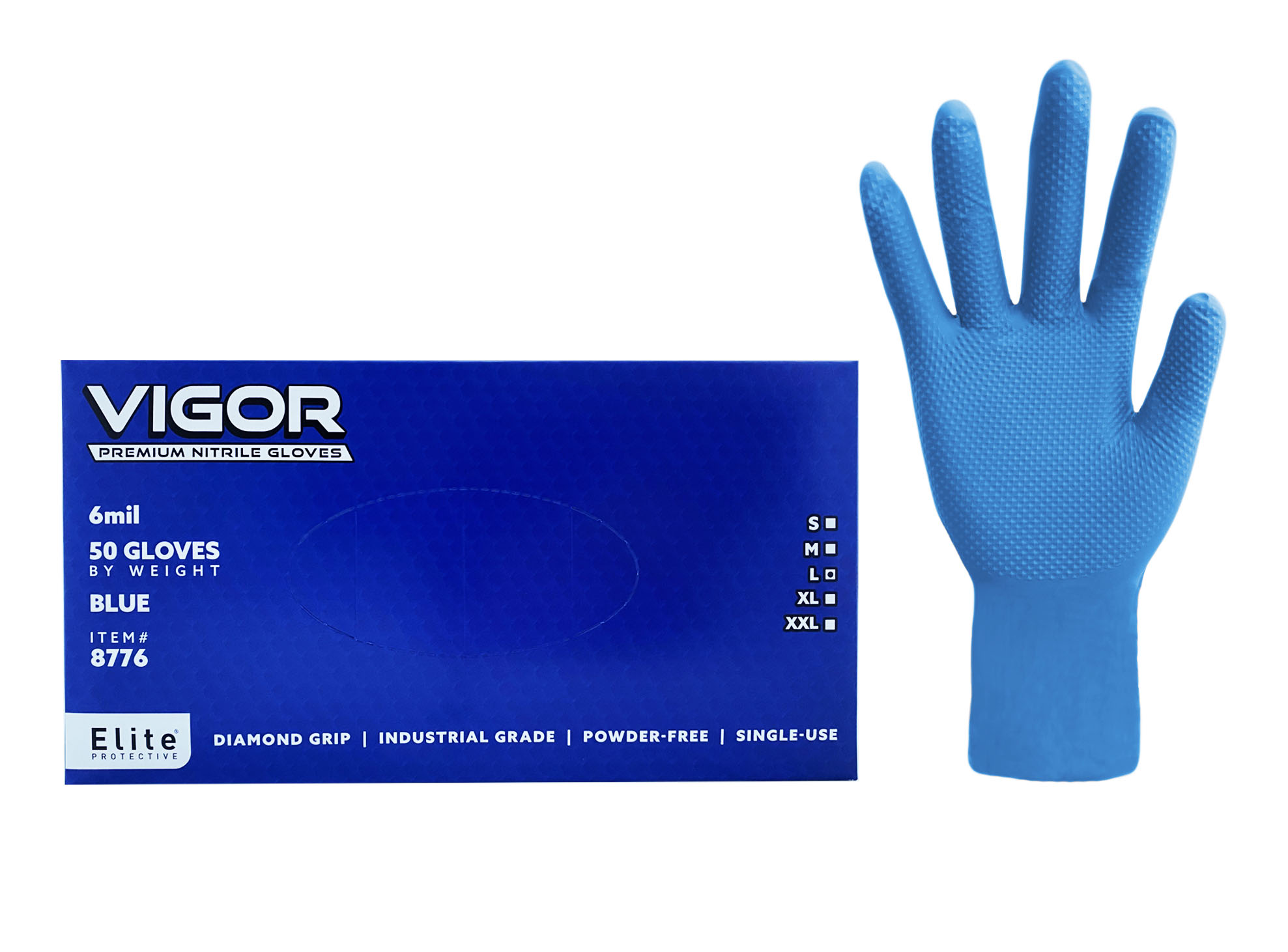 Elite Vigor, 6 mil, Blue, Industrial Grade, Powder-Free, 50 gloves/box [size: S-XXL]