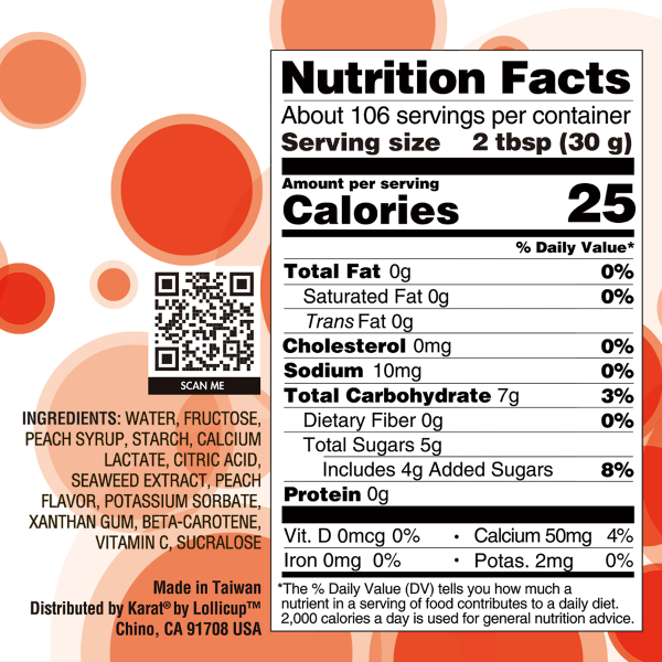 Water, Fructose, Peach Flavored Syrup, Starch, Calcium Lactate, Seaweed Extract, Flavor, Malic Acid, Potassium Sorbate