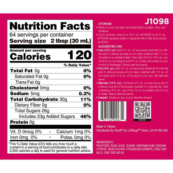 Ingredients:Â Fructose, Rose Juice, Sugar, Xanthan Gum, Sodium Citrate, Rose Flavor, Potassium Sorbate, FD&C Red NO.3, FD&C Red NO. 45.